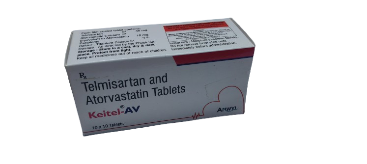 KEITEL-AV Tablet is a combination of two medicines: Telmisartan and Atorvastatin which treat high blood pressure and cholesterol. Telmisartan is an angiotensin receptor blocker (ARB). It works by blocking the hormone angiotensin thereby relaxing blood vessels and lowering blood pressure. Atorvastatin is a lipid-lowering medication (statin). It works by blocking an enzyme (HMG-CoA-reductase) that is required in the body to make cholesterol. It thus lowers “bad” cholesterol (LDL), triglycerides and raises “good” cholesterol (HDL).