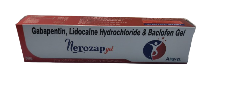 Nerozap Gel is a combination of three medicines: Gabapentin, Lidocaine, and Baclofen. Gabapentin is an alpha 2 delta ligand which decreases pain by modulating calcium channel activity of the nerve cells. Lidocaine is a local anesthetic which works by blocking pain signals from the nerves to brain thereby decreasing the sensation of pain. Baclofen is a muscle relaxant. It works on the centres in the brain and spinal cord to relieve muscle stiffness or spasm without reduction in strength. This improves pain and movement of muscles. Together, they relieve neuropathic pain (pain from damaged nerves).